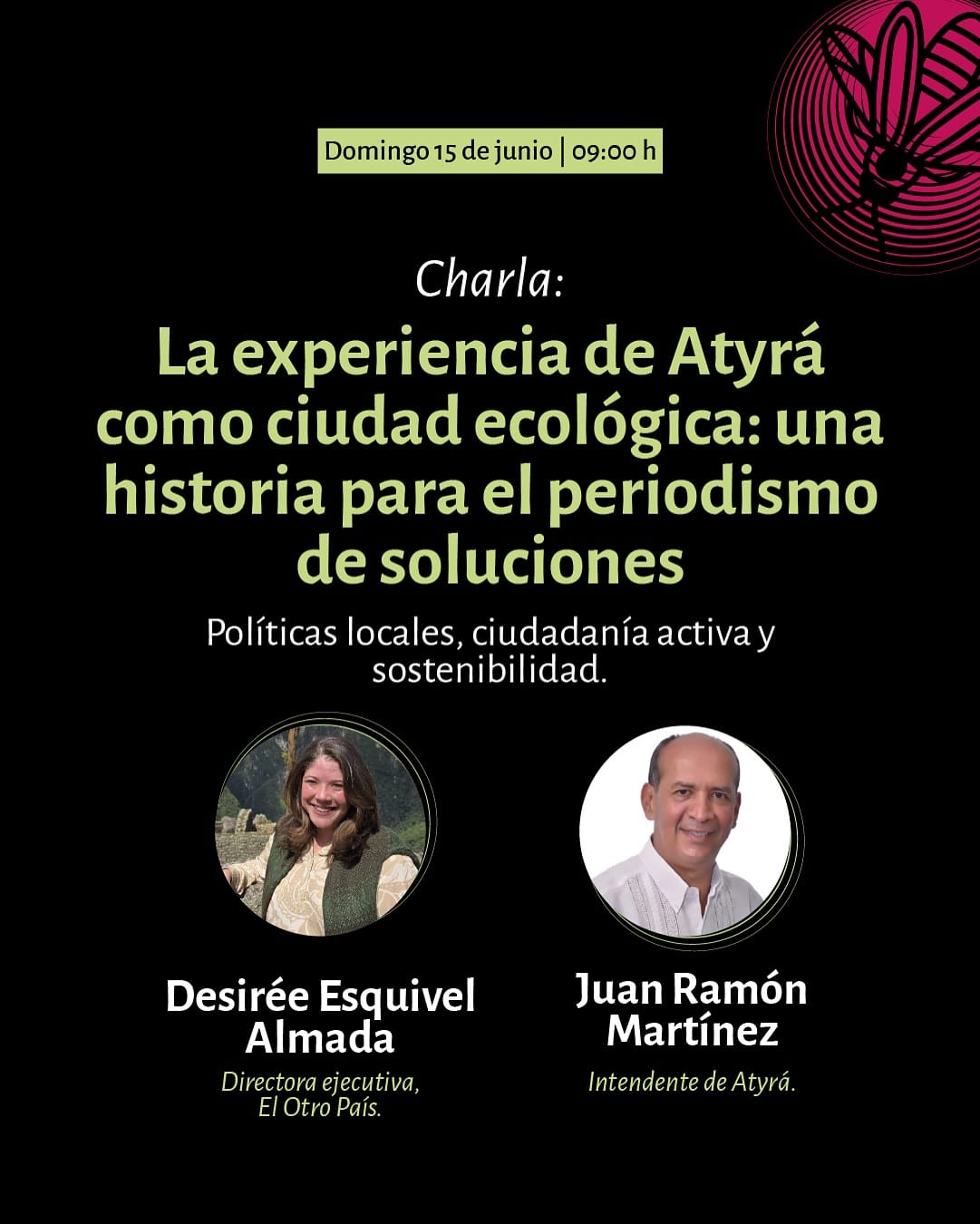 En la misma charla, Desirée Esquivel Almada, directora de El Otro País, hablará del periodismo de soluciones. El mismo supone un cambio en la manera de abordar el oficio periodístico. Esto se debe que, en lugar de reducirse a denunciar las problemáticas, se aborda un enfoque más motivador, al narrar historias de personas y comunidades que buscan solucionar las problemáticas, como sucede precisamente en el caso de Atyrá y su lucha a favor del medio ambiente, que ya ha inspirado positivamente a otras comunidades de Cordillera. Será moderadora Graciela Galeano, periodista y editora general de El Otro País.