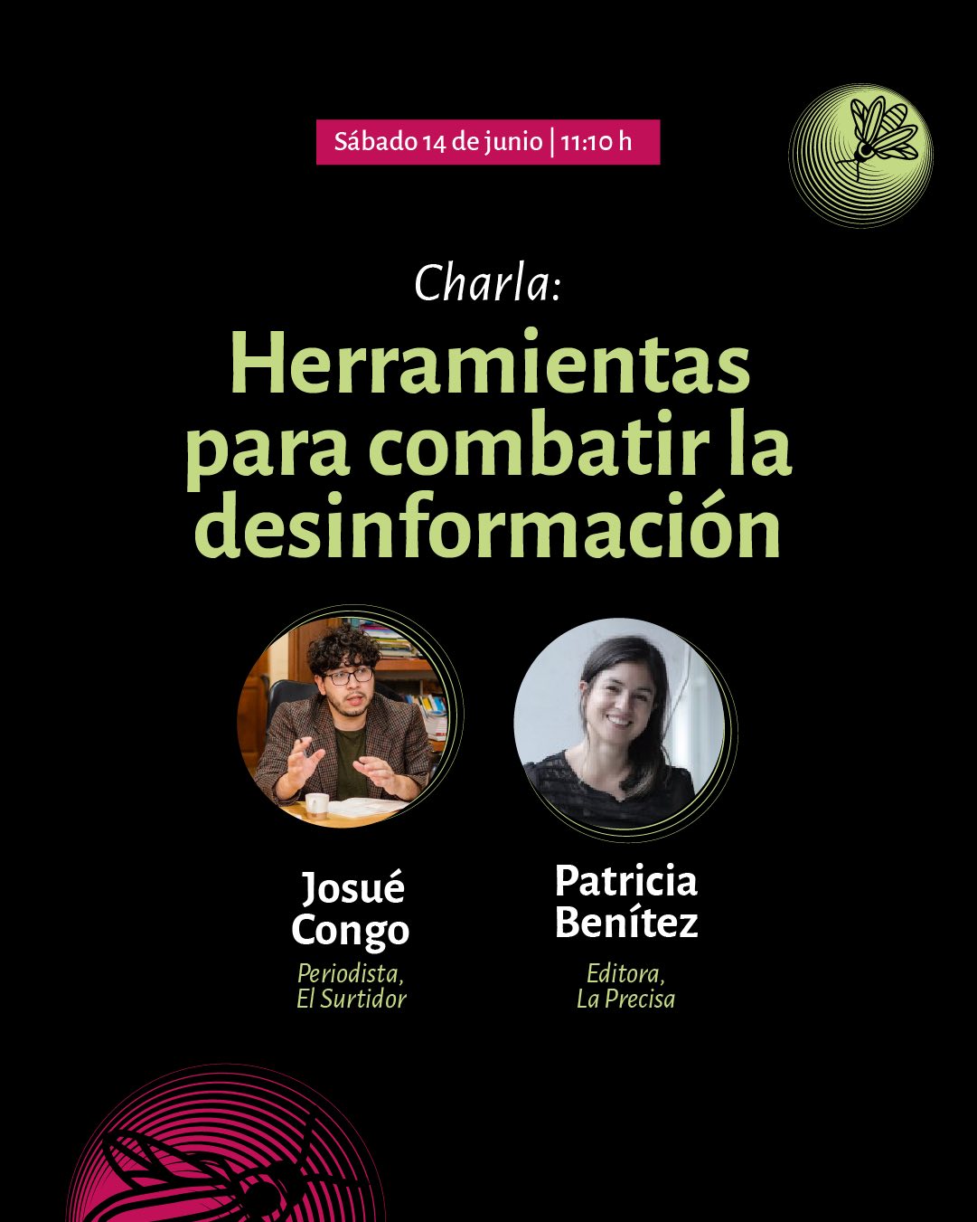 La charla “Herramientas para combatir la desinformación”, será llevada adelante el sábado, a las 11.10. Estará a cargo de Josué Congo, periodista de El Surtidor; y Patricia Benítez, periodista y editora de La Precisa, medio especializado en verificación de noticias y publicaciones.
