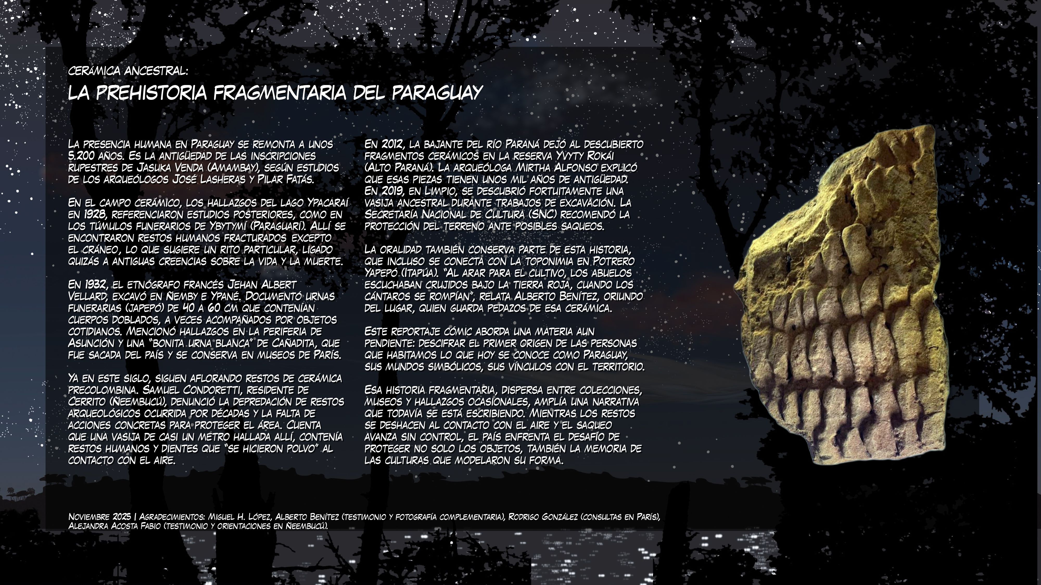 “En Ñeembucú, donde los esteros se extienden como espejos y las lagunas guardan secretos milenarios, el pasado no está dormido… solo espera ser escuchado. En el remoto pueblo de Cerrito, a orillas del río Paraná, fragmentos de cerámica ancestral emergen como susurros del tiempo. Lo que para algunos es solo barro viejo, para otros es la huella de una civilización olvidada”, decía la propuesta entregada por Marcelo David Sandoval, que fue seleccionada junto a otros cuatro proyectos para recibir fondos del Premio Fundación Itaú de Periodismo Cultural, en el marco del Roa Fastos Fest.